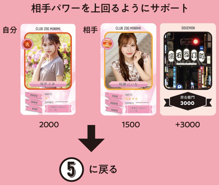 (デッキから1枚引き、サポートカード選択し勝敗を決める)