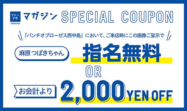 ファンクラWEBマガジン×バンチ オブ ローゼス西中島特別キャンペーン!ご来店時にこの記事の画面をご呈示いただくと、「麻原つばきちゃん指名料無料」or「お会計から2,000円OFF」のいずれかの特典を進呈。ご来店お待ちしています!