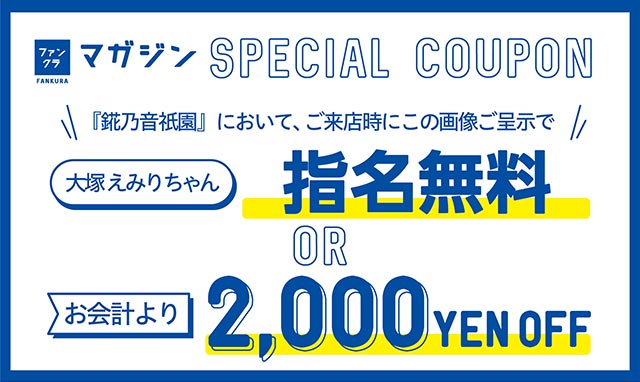 ファンクラWEBマガジン×錵乃音 祇園特別キャンペーン!ご来店時にこの記事の画面をご呈示いただくと、「大塚 えみりちゃん指名料無料」or「お会計から2,000円OFF」のいずれかの特典を進呈。ご来店お待ちしています!