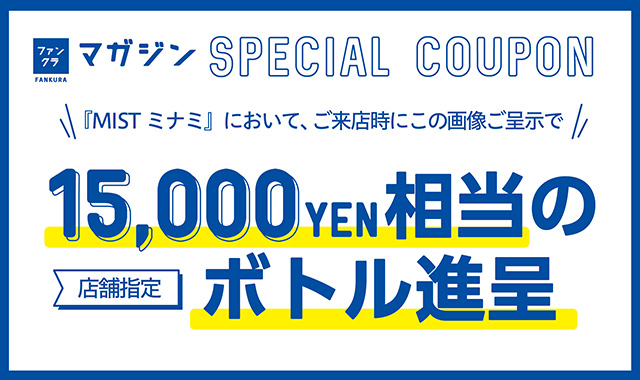 ファンクラマガジン×MISTミナミ特別キャンペーン!ご来店時にこの記事の画面をご呈示いただくと、店舗指定ボトル進呈!!(15,000円相当)ご来店お待ちしております!