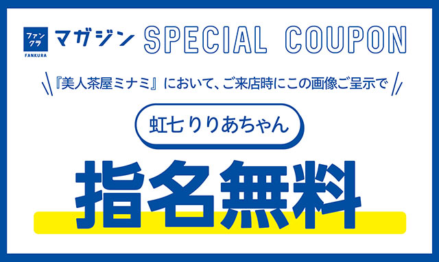 ファンクラマガジン×美人茶屋ミナミ特別キャンペーン!ご来店時にこの記事の画面をご呈示いただくと、「虹七りりあちゃん指名料無料」の特典を進呈。ご来店お待ちしています!